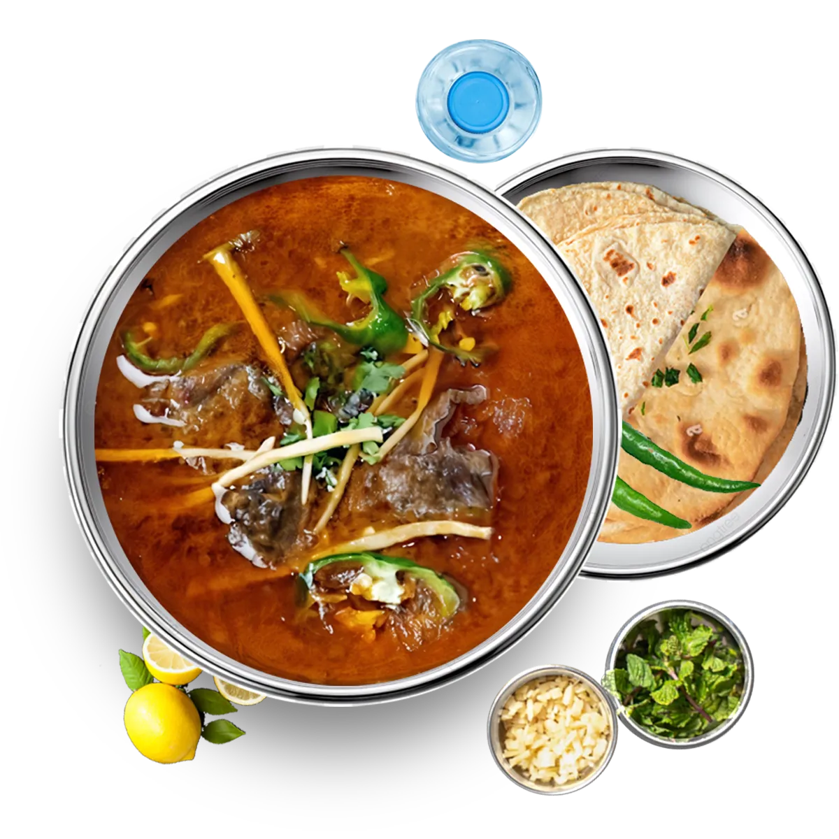 Meat Stew (Mutton or Beef Shank) Garnished with Chopped Ginger, Coriander & Green Chilli, 2 Naan/Roti and Water Bottle